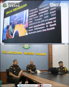 Senin, 15 Juli 2024 bertempat di Ruang Vicon Kejari Subang. Kepala Kejaksaan Negeri Subang Dr. Akmal Kodrat,S.H.,M.Hum. didampingi Kepala Seksi Tindak Pidana Umum Adib Fachri Dilli,S.H. serta Kepala Subseksi Penuntutan, Eksekusi dan Eksaminasi Randika Ramadhani Erwin, S.H., M.H. Melaksanakan Ekspose Restorative Justice bersama dengan Kepala Kejaksaan Tinggi Jawa Barat, Wakil Kepala Kejaksaan Tinggi Jawa Barat, Aspidum, serta Jajaran JamPidum Kejaksaan Agung terhadap Perkara penadahan atas nama tersangka Andi Panji Apriansyah Bin Joni.