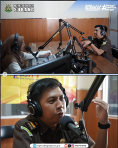 Rabu 10 Juli 2024. Kejaksaan Negeri Subang dalam program Jaksa Menyapa sebagai Narasumber Kepala Subseksi Penuntutan, Eksekusi dan Eksaminasi pada Seksi Tindak Pidana Umum Kejaksaan Negeri Subang Randika Ramadhani Erwin, S.H., M.H. Dengan tema : “Restorative Justice pada Kejaksaan Negeri Subang” bertempat di Radio Benpas 98’2 FM Kab. Subang.