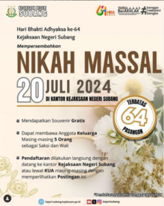 Sebagai bagian dari rangkaian acara Hari Bakti Adhyaksa ke-64. Kejaksaan Negeri Subang akan mengadakan acara Nikah Massal yang akan di gelar pada: