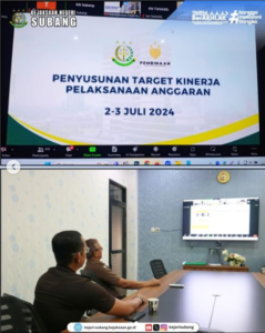 bertempat di Ruang Vicon Kejari Subang. Bendahara Pengeluaran Kejari Subang Ferial Telly Sabana, S.H. beserta Penyusun Bahan Informasi dan Publikasi Kejari Subang Nana Sumarna, S.H. mengikuti giat vicon terkait Penyusunan Target Kinerja Pelaksanaan Anggaran, yang di ikuti seluruh satuan kerja Kejaksaan RI.