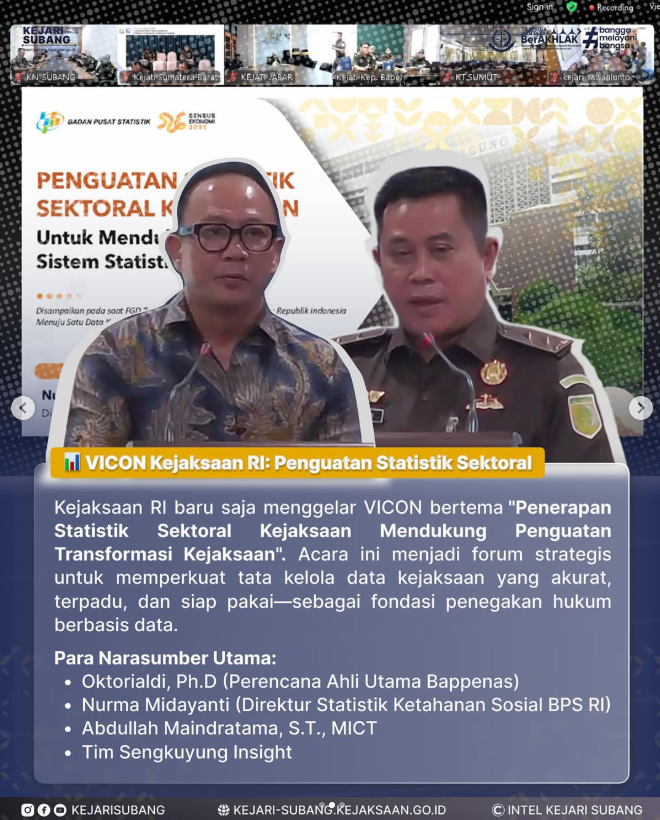 Hari ini Kejaksaan RI menggelar Virtual Conference bertema “Penerapan Statistik Sektoral Kejaksaan Mendukung Penguatan Transformasi Kejaksaan”. Sebuah langkah penting untuk mendorong Kejaksaan menjadi institusi hukum yang berbasis data, bukan hanya dokumen.