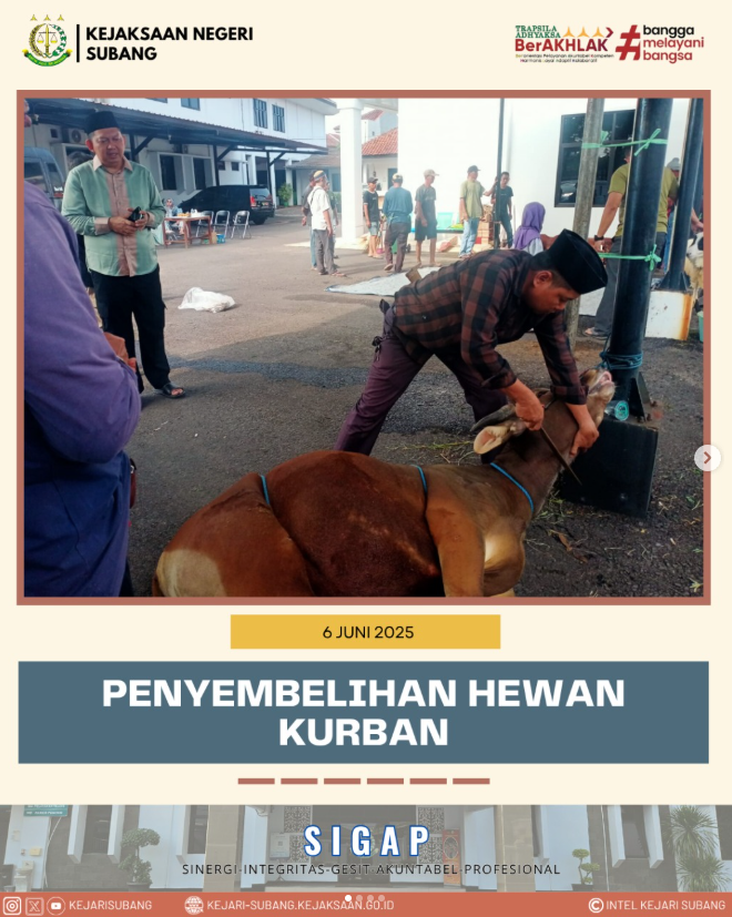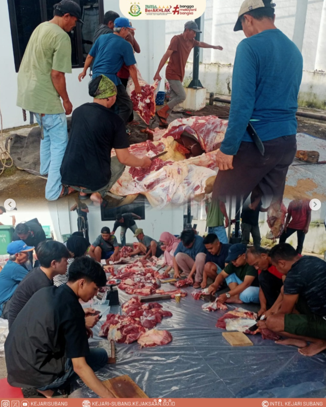 Kepala Kejaksaan Negeri Subang Dr. Bambang Winarno, S.H., M.H. beserta seluruh Jajaran Kejaksaan Negeri Subang Bersama Pengurus DKM Hasanatul Kadir melaksanakan Penyembelihan Hewan Qurban alam rangka menyambut Hari Raya Idul Adha bertempat di Kantor Kejaksaan Negeri Subang.