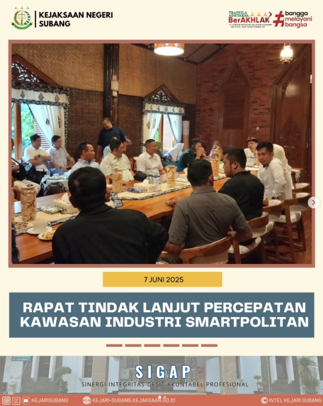 Kepala Kejaksaan Negeri Subang Dr. Bambang Winarno, S.H.,M.H. menghadiri Undangan Rapat Pecepatan Pembangunan Kawasan Industri Subang Smartpolitan (PT. Suryacipta Swadaya) Bersama Unsur Forkopimda Kabupaten Subang dan dipimpin Oleh Gubernur Jawa Barat Dedi Mulyadi yang bertempat di Lembur Pakuan, Sukadaya Desa Sukasari, Rawalele, Kec. Dawuan, Kabupaten Subang.